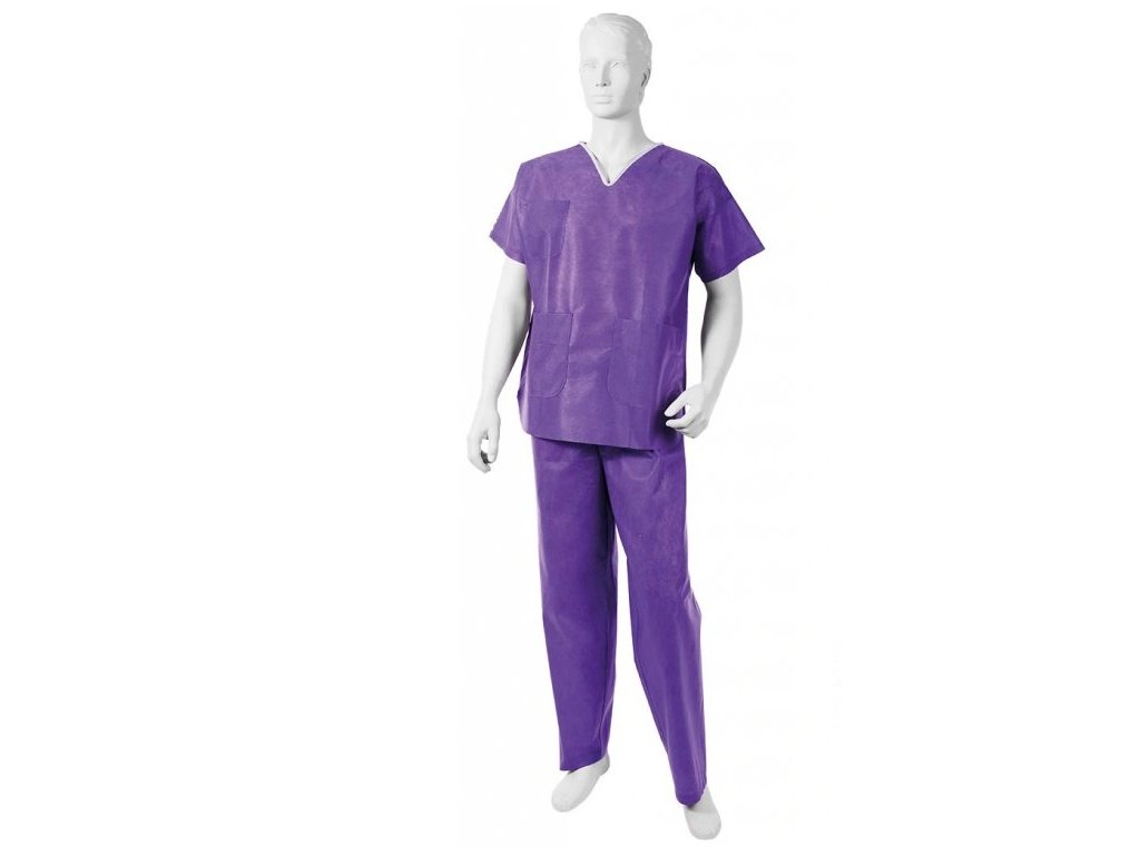 Dvojdílný chirurgický komplet vyrobený z antistatické netkané textilie z polypropylenu typu SMMS. Halena se srdcovým výstřihem obšitým lemem se třemi kapsami a rozparky na bocích, kalhoty zapínané v pase stahovacími pásky.
