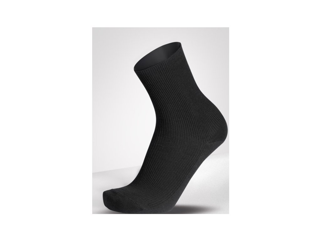 Speciální ponožky s neškrtícím lemem, žebrované v černé barvě s řetízkovanou špicí z BIO bavlny a sloučeninou stříbra Prolen® Siltex, která má antibakteriální účinky. Biogenické ionty stříbra jsou aplikovány přímo do jádra vlákna.