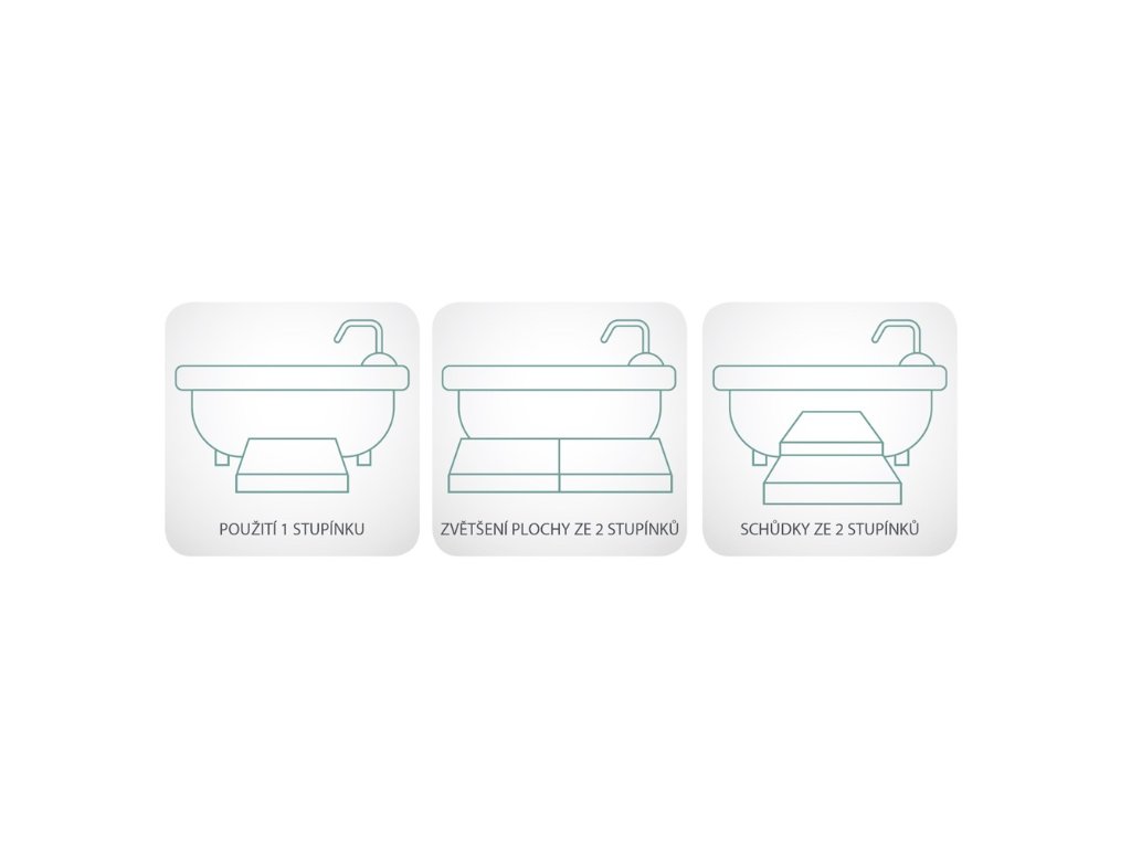 Pohodlné řešení vnější dorovnání výšky dna vany, které ulehčuje bezpečný přesun do/z vany. Součástí balení jsou dva 2 cm zvyšovací díly, kterými lze docílit požadovanou výšku 5, 7 nebo 9 cm. Více stupínků lze mezi sebou vzájemně nakombinovat a spojit pro zvětšení plochy nebo jako schůdky.