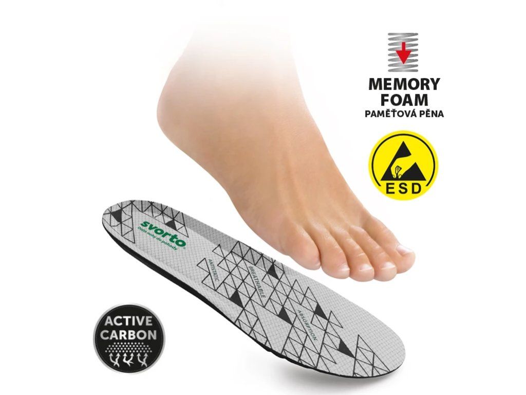 Jsou vyrobeny ze 100% recyklované antibakteriální a antistatické PU pěny s obsahem aktivního uhlíku, který výborně absorbuje vlhkost. Měkká a zároveň pružná struktura Integrované paměťové pěny, jejíž chování se mění v závislosti na teplotě, se přizpůsobí anatomii nohy a zajistí ideální rozložení tlaků plosky nohy.